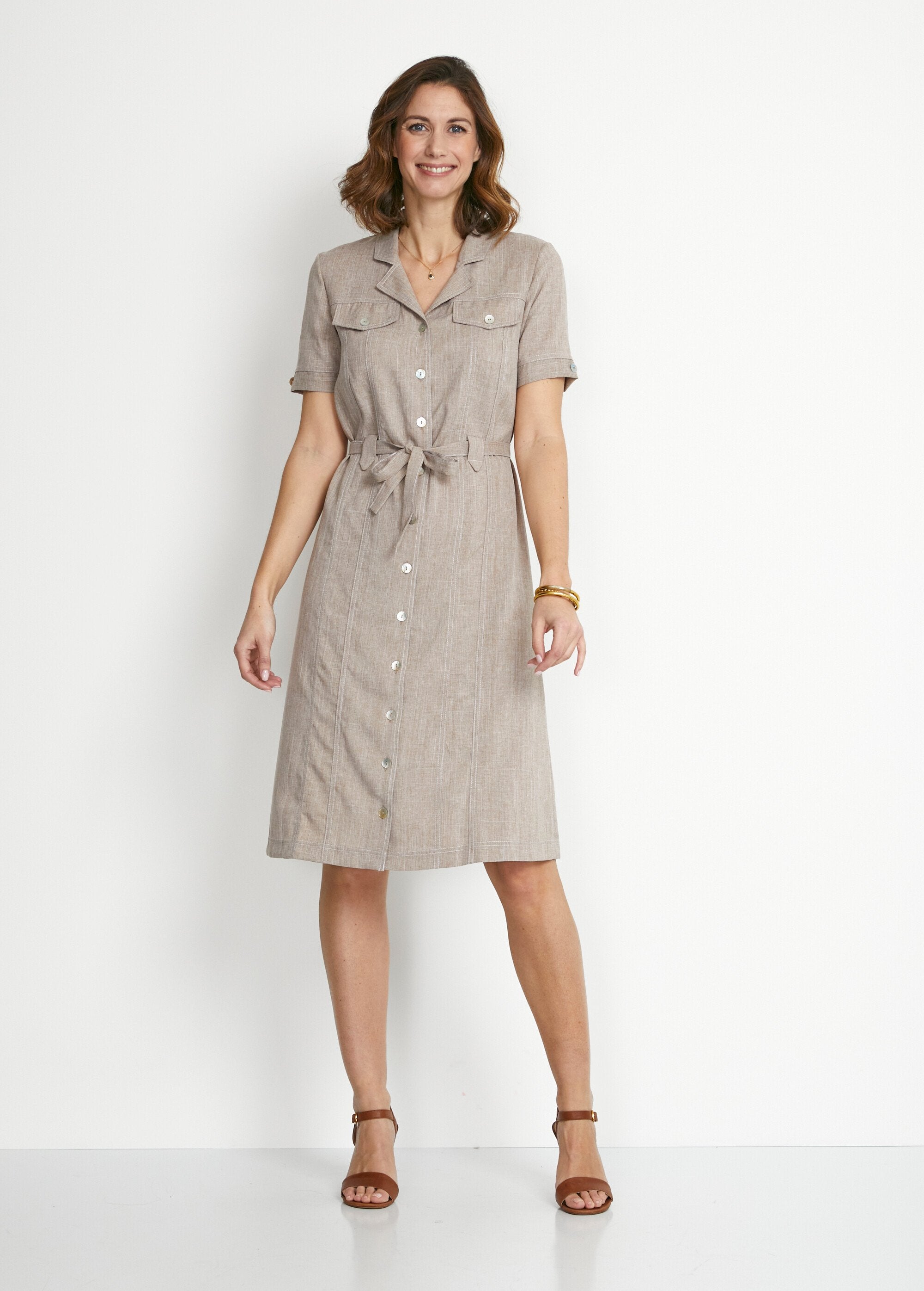 El vestido blusa perfecto para el día a día, elegante y desenfadado. Totalmente abotonado, estructurado con canesú delantero y recortes. Cuello con muescas. Solapas abotonadas en el pecho con efecto bolsillo. Cintura del mismo tejido para anudar bajo elegantes trabillas. Canesú con botón decorativo en el bajo de las mangas cortas. Acabado acolchado.