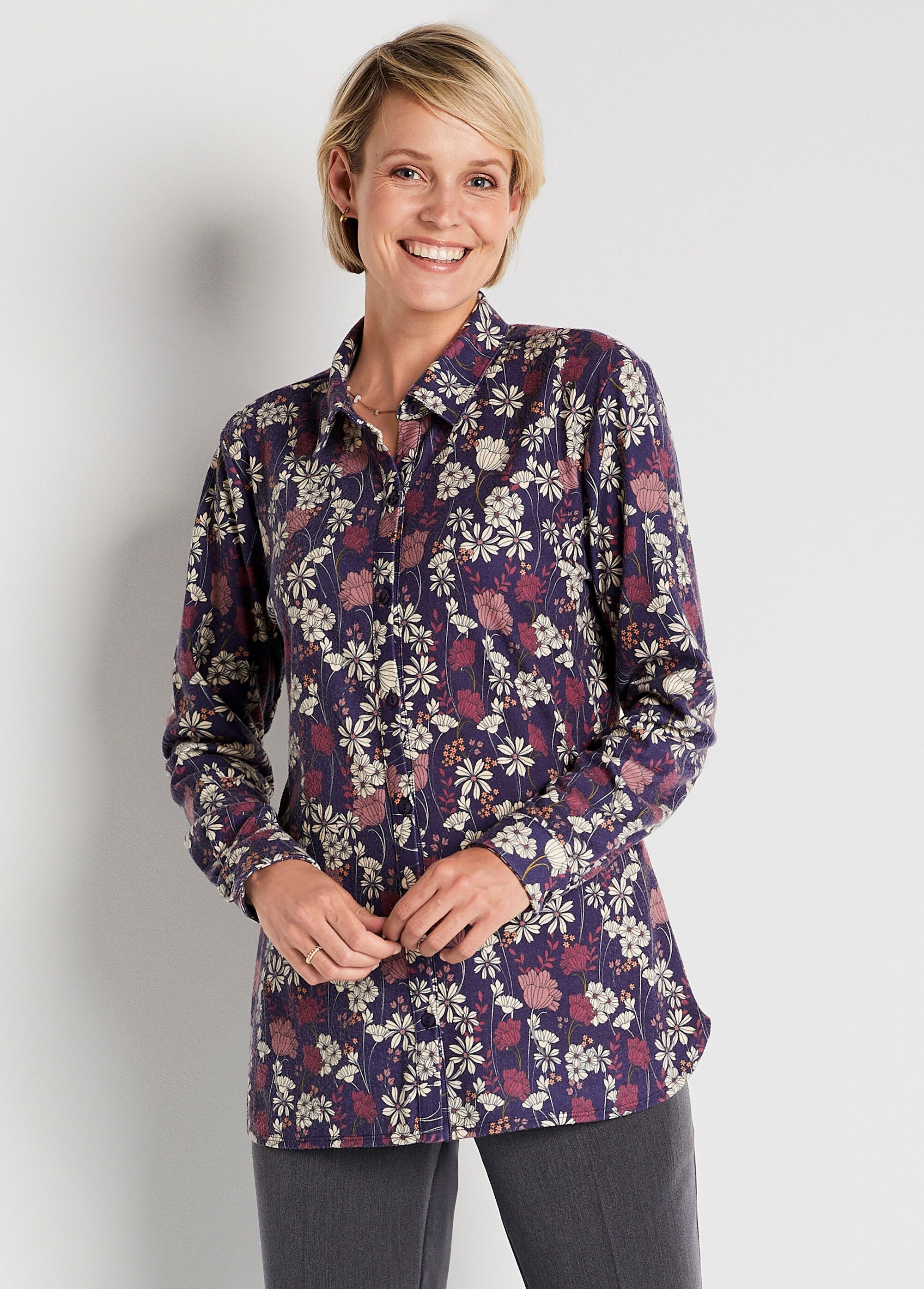 La blusa combina fantasía floral, modernidad y comodidad. Cuello puntiagudo en el soporte del cuello. Tapeta de botones delante. Manga larga, puños abotonados. Pliegue de caja debajo del canesú central de la espalda. Base ligeramente redondeada. Acabados cosidos.