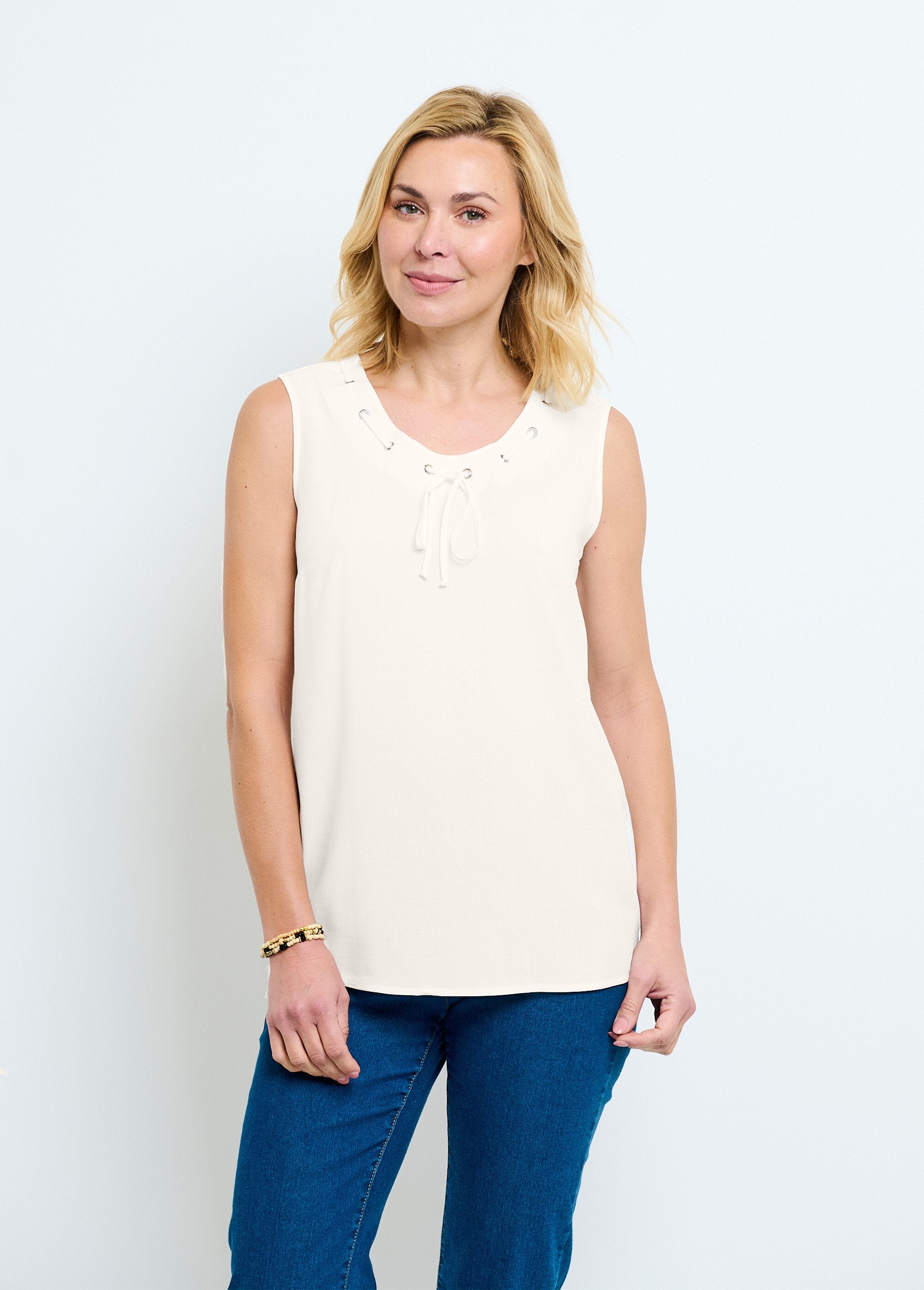 Bonita paleta de colores y suave fluidez para la camiseta de tirantes de mujer que ofrece una silueta veraniega actual y cómoda. Su línea recta se ve realzada por un claro escote redondeado, realzado con un elegante lazo bajo los ojales. Base recta.