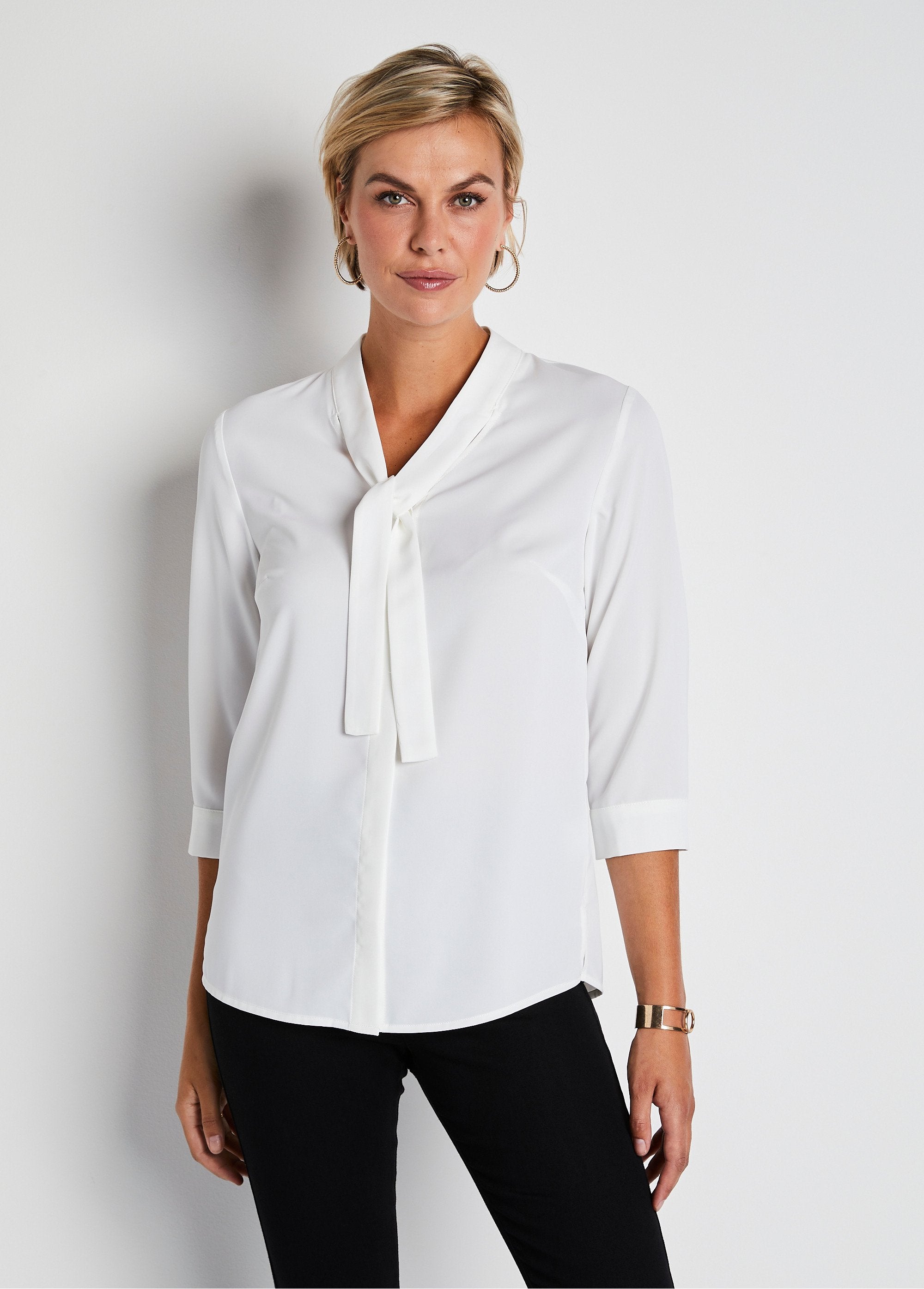 Esta túnica le da un aspecto ultra chic a la silueta. Escote en V realzado con una solapa para anudar. Totalmente abotonado delante, tapeta con botones ocultos. Pliegue plano bajo el canesú central de la espalda. Mangas 3/4, pulseras abotonadas con pliegues y trabilla resistente. Base ligeramente redondeada, dividida a los lados. Acabados cosidos.