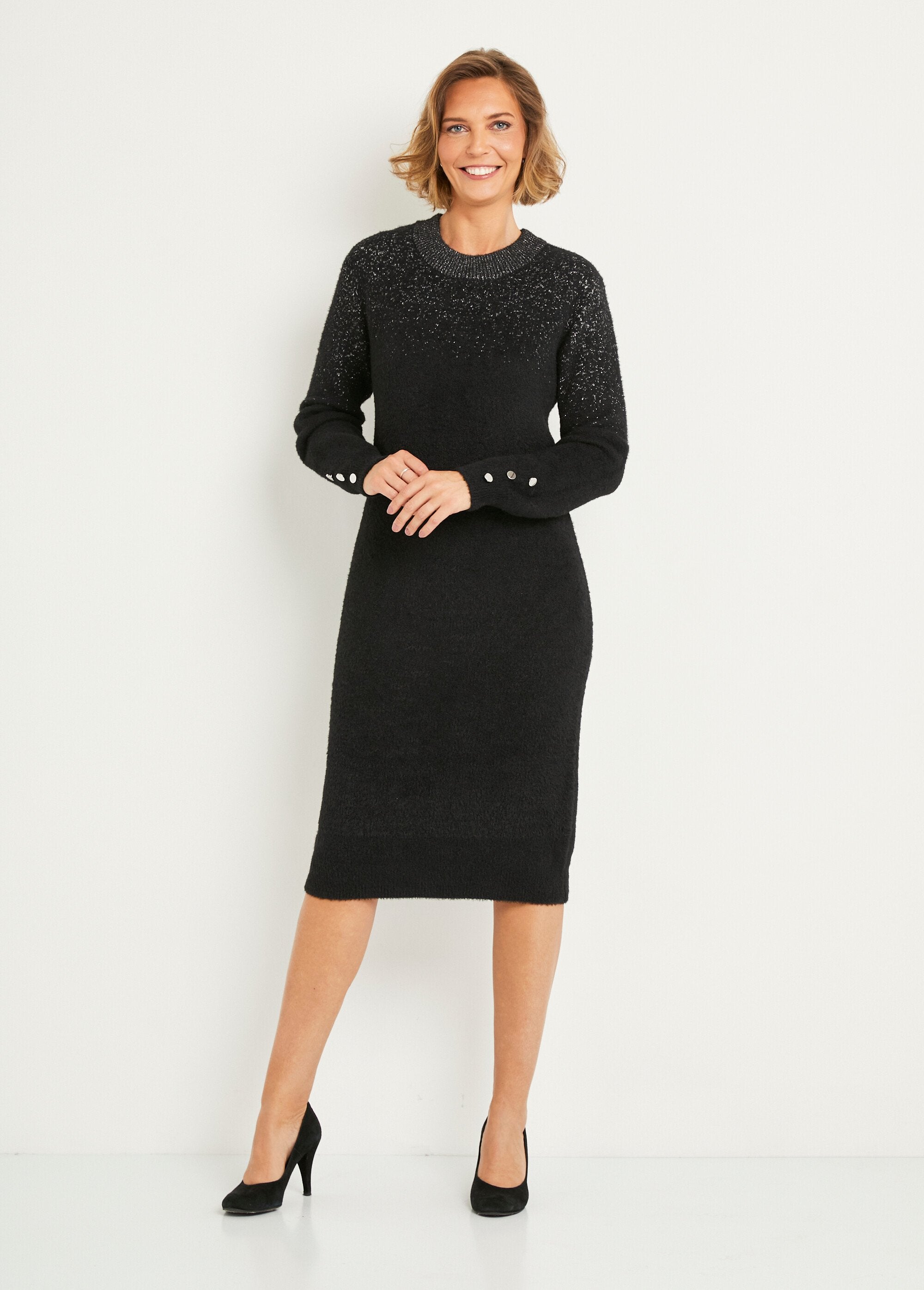 Elegante y festiva con zapatos de tacón, puede estar relajada con medias y botas abrigadas. Modernidad, suavidad, calidez y feminidad... Esto es lo que te ofrece este vestido jersey de mujer que combina hábilmente punto peludo y detalles brillantes.